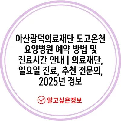 아산광덕의료재단 도고온천 요양병원 예약 방법 및 진료시간 공지 | 의료재단, 일요일 진료, 추천 전연락, 2025년 정보 에 대해 자주 묻는 질문 TOP 5