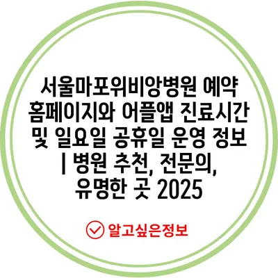 서울마포위비앙병원 예약 홈페이지와 어플앱 진료시간 및 일요일 공휴일 운영 정보 | 병원 추천, 전연락, 유명한 곳 2025 에 대해 자주 묻는 질문 TOP 5